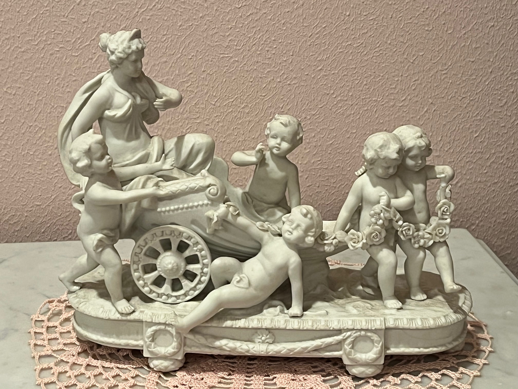 D399 Stunning White Carrera and two tone Bronze Statue Clock, in graceful, classical form and high quality. Just as found and used simply as decor for last two owners for 50 plus years, 23 inches tall and 16 inches wide, Circa 1880