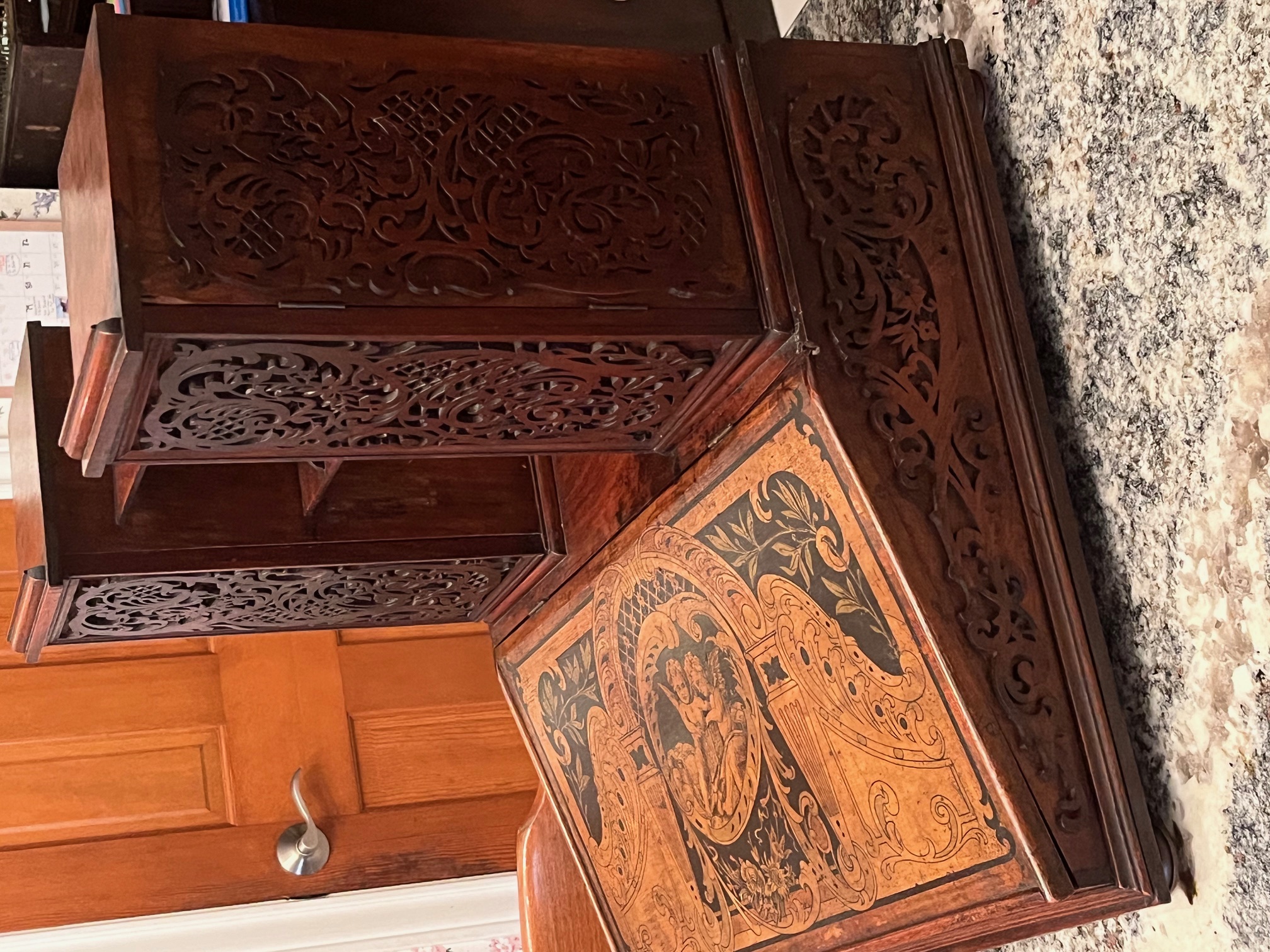Sold D400 Vintage Carved Mahogany Etagere’ ideal for hallway, entry area or living room display, recently detailed and hand polished, will be sold to first viewer who wants it for $600 😊
